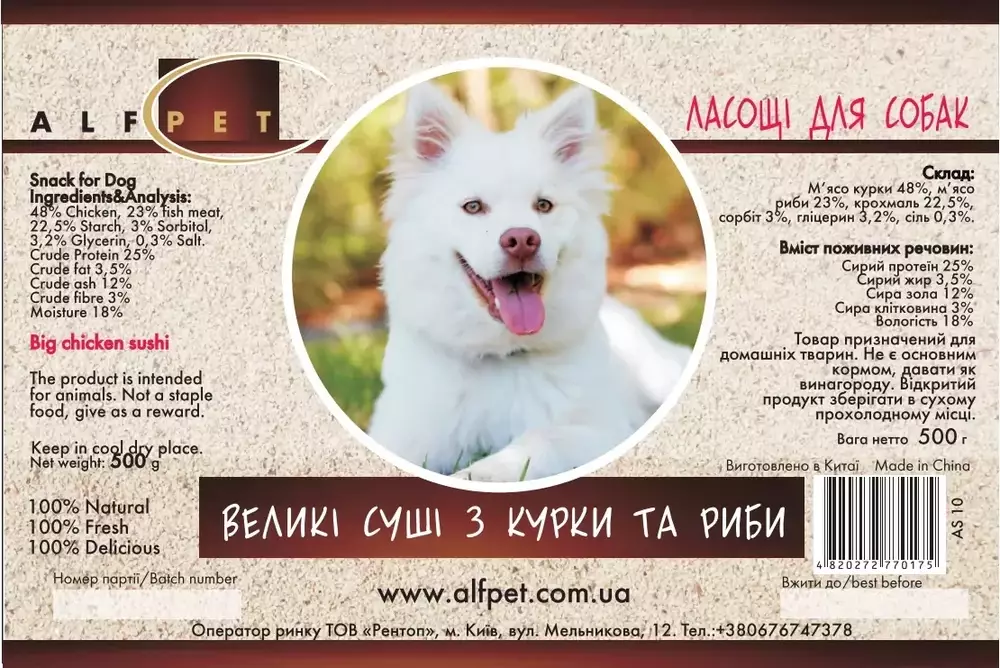 Натуральні ласощі для собак AlfPet (АльфПет) AS10 Великі суші з курки та риби 500 г