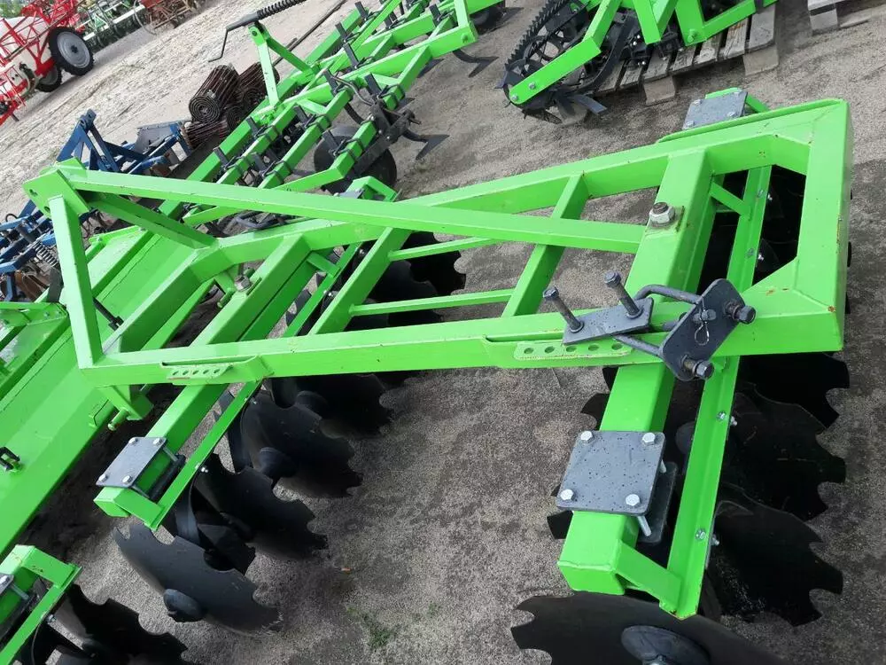 Навесная 2-х секционная дисковая борона ширина захвата 1,5 м серии U363 фирмы Bomet (Польша) предназначена для предпосевной обработки плотных вспаханных на зиму почв (кроме каменистых) с таким содержанием влаги в почве, которое позволило бы произвести их правильную обработку. Дисковая борона предназначена также для разрывания и размельчения дернистых отвалов после пахоты лугов других пастбищных угодий, а также для выполнения лущения стерни непосредственно после срезания растений. Дисковые бороны могут использоваться для резки и заделывания навоза после разбрасывания зеленых удобрений малой и средней величины. Машина может быть использована для перемешивания с землей минеральных удобрений и извести. Работа может выполняться на склонах до 8,5 градусов.