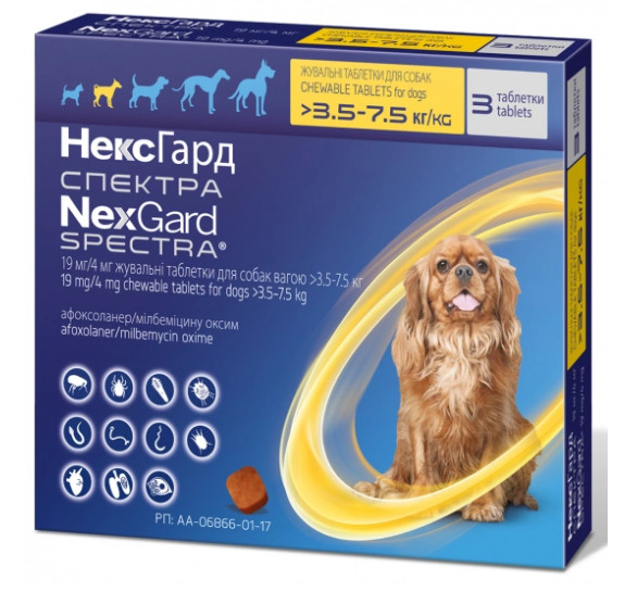 19 мг/4 мг - для собак вагою 3,5-7,5 кг (вага таблетки 1 г);