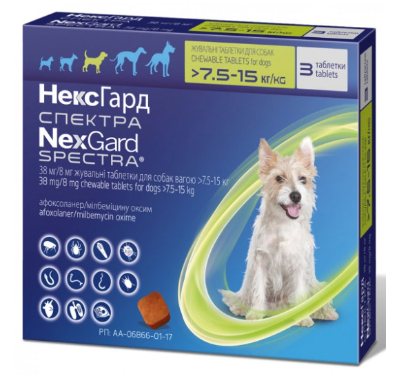 Нексгард Спектра 7.5-15 кг таблетки від бліх кліщів та гельмінтів для собак (1 таблетка) Merial (термін до 01.2026)