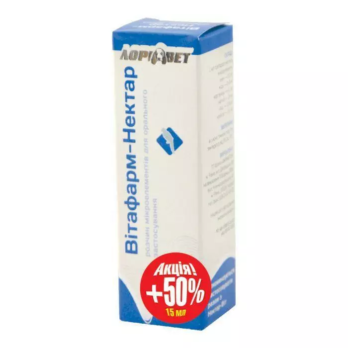 НЕКТАР - ВІТ Профілактика і лікування у папуг, канарок, хом'ячків, морських свинок і шиншил дефіциту жиророзчинних і водорозчинних вітамінів. Забезпечує нормалізацію обміну речовин в організмі тварин і птахів, зниження негативного впливу стресових ситуаціях при транспортуванні, при несприятливих умовах (холод, перегрівання), при незбалансованому годуванні, при захворюваннях, що супроводжуються анорексією.