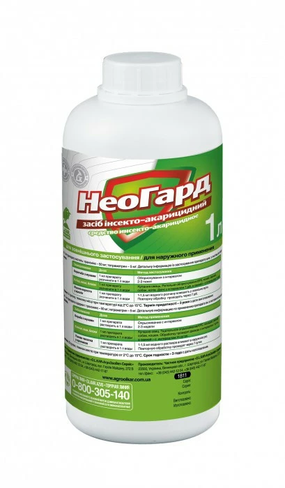 Неогард діє специфічно, як нейротоксин тільки на нервові синапси у комах і практично не впливає на обмін речовин у теплокровних тварин. Згубно активний проти саркоптоїдних, іксодових, демодекозних кліщів, вошей, бліх, волосоїдів, мух. Препарат відноситься до групи малотоксичних для теплокровних тварин сполук, у рекомендованих дозах не чинить місцево-подразнюючої та сенсибілізуючої дії. Токсичний для риб і бджіл.