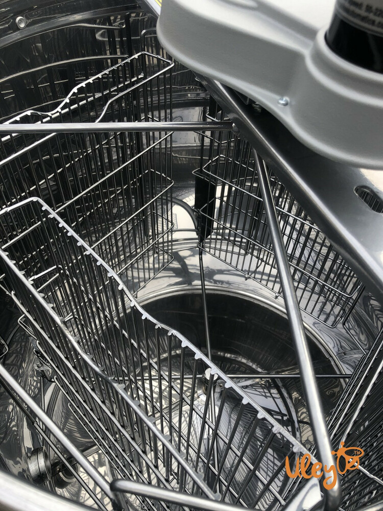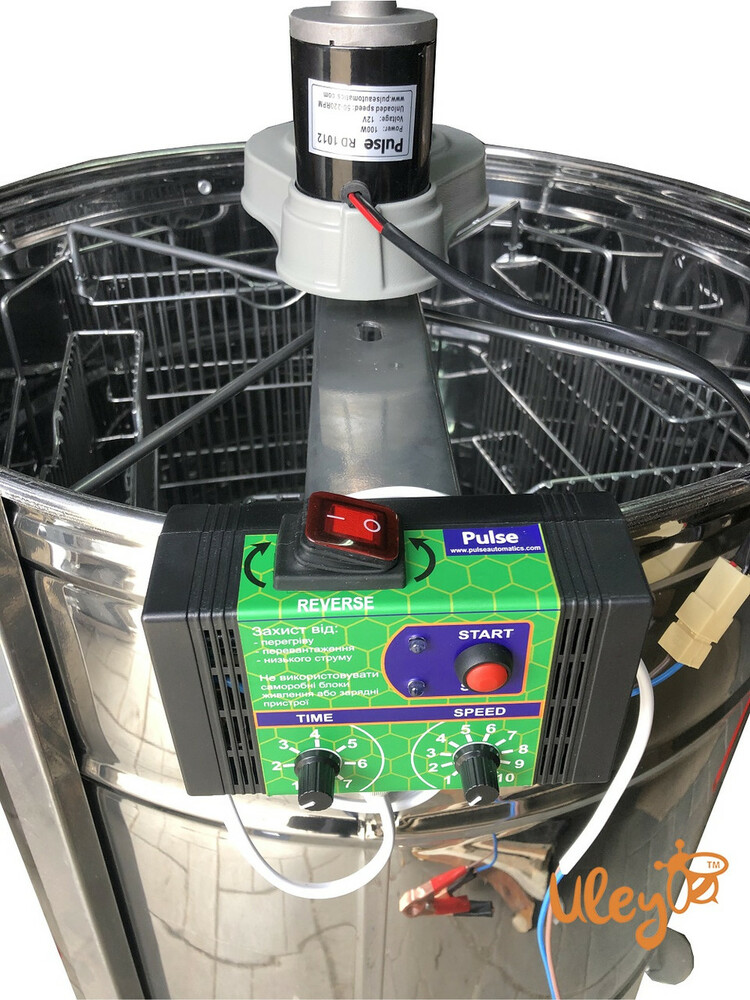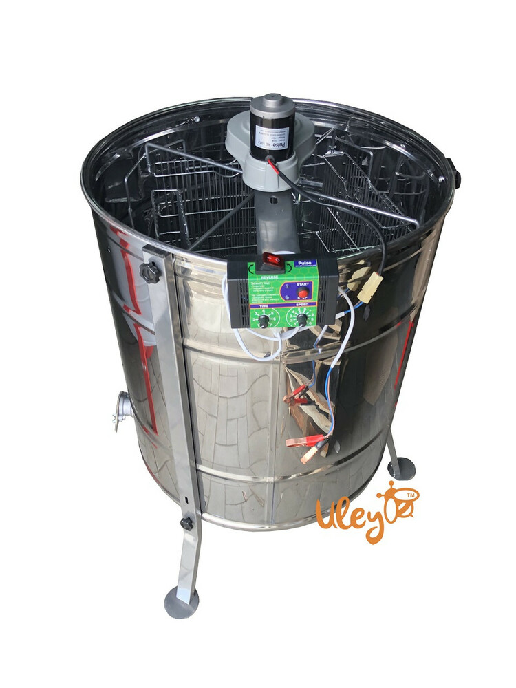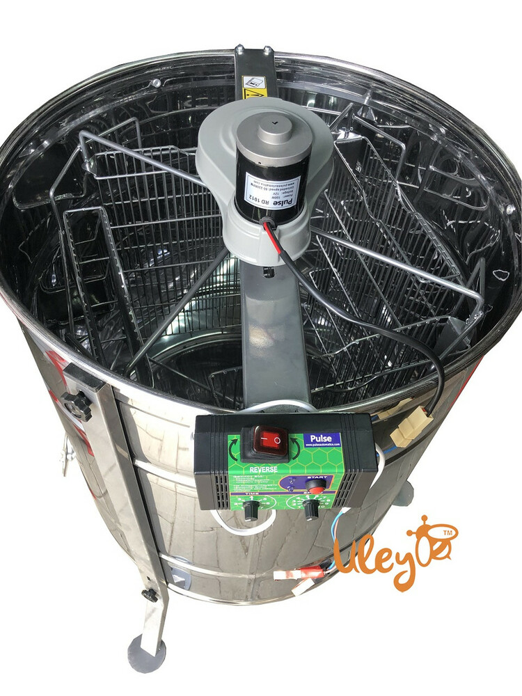 Нержавіюча медогонка 4-х рамкову, поворотна. Ремінний привід. З підставкою і електроприводом "Pulse" – призначена для відкачування рамок хордиальным способом, вміщує 4 рамки "Дадан" висотою 300 мм, 4 рамки "Рута 230 мм або 8 магазинних рамок (полурамок) заввишки 145 мм