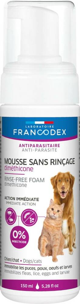 Піна проти бліх та вошей LABORATOIRE FRANCODEX (Лаборатуар Франкодекс) з диметиконом (силіконовою олією) для котів і собак. Диметикон створює на поверхні шкіри захисну плівку та діє як липка пастка для паразитів, знерухомлюючи їх за рахунок склеювання кінцівок. Вони більше не можуть рухатися і падають з тварини або видаляються під час розчісування шерсті. Є безпечним засобом, який можливо застосовувати до тварин у період вагітності та лактації. Не потребує змивання.