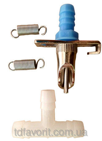 В комплекте с автопоилкой идёт тройник для соединения с шлангами и пружина, для крепежа к сетке.