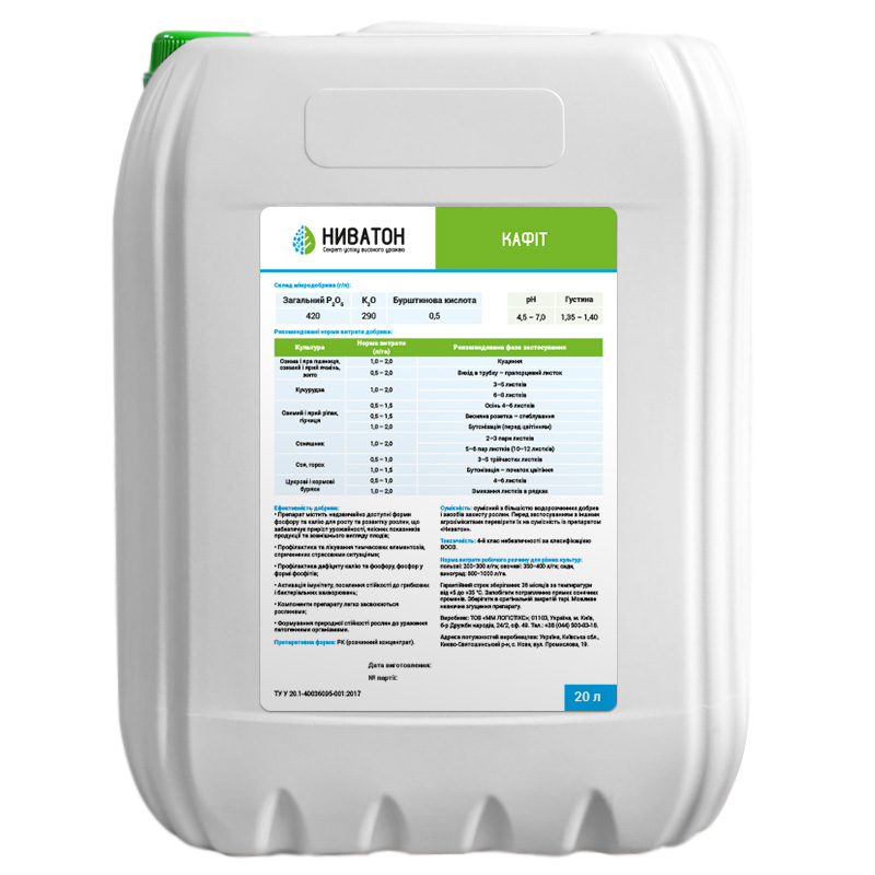 Ниватон Кафіт : Р2О5 (фосфіт)–420; К2О–290; бурштинова к-та–0,5