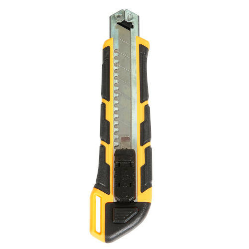 Рукоятка ножа має ергономічну форму, що забезпечує комфортне утримання в руці та запобігає ковзанню під час роботи. Корпус виготовлений із міцного пластику та металу, що гарантує довговічність інструмента. Механізм фіксації дозволяє швидко та надійно закріплювати лезо, запобігаючи його випадковому зміщенню.