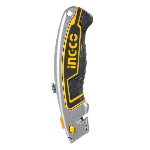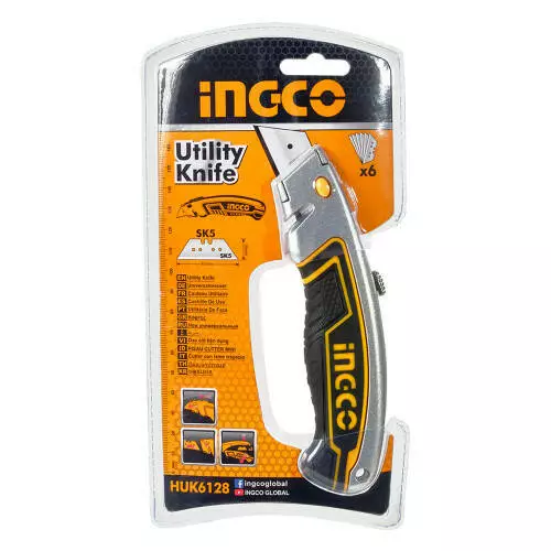 Ніж-трапеція "Profi" 6 лез SK5 INGCO INDUSTRIAL — універсальний інструмент для різання лінолеуму, картону, шпалер та інших матеріалів. Цей ніж є надійним та довговічним завдяки високоякісному лезу з вуглецевої сталі SK5, яке забезпечує відмінну гостроту і довгий термін служби. Корпус ножа виготовлений з цинкового сплаву, що захищає інструмент від механічних пошкоджень і гарантує йому високу міцність.