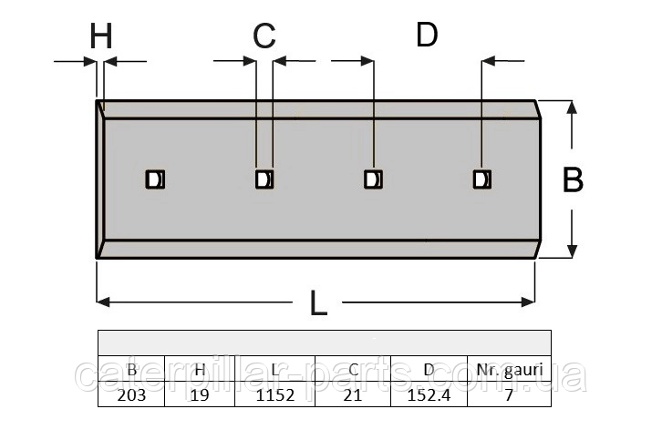 Болт типу Caterpillar на центральній ріжучій кромці бульдозера Caterpillar D5. Це двостороння ріжуча кромка ковша з подвійною фаскою товщиною 0,75 дюйми, шириною 8 дюймів і довжиною 45,375 дюйми. Потрібно 7 болтів плуга 3/4″X 2 1/2″(750X250) та 7 шестигранних гайок 3/4″(750 HEX NUT). Відстань між отворами під болти складає 6 дюймів від центру до центру отворів під болти та 4,69 дюйма при вимірі від краю ріжучої кромки ковша до центру першого отвору.