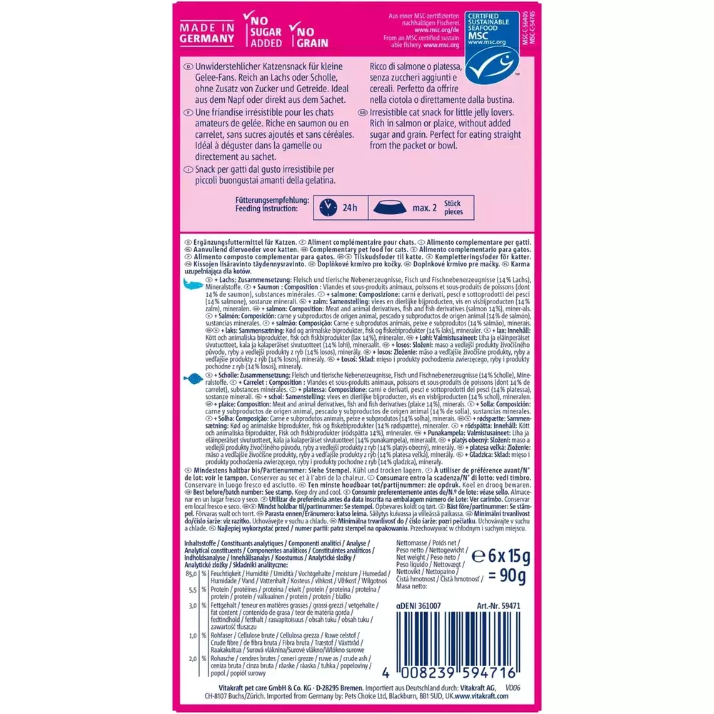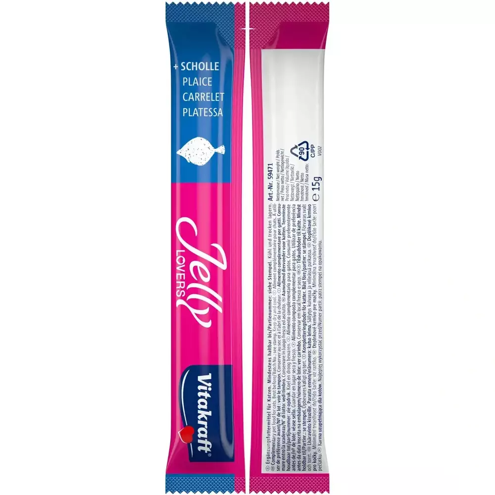 Набір ароматних вологих ласощів у вигляді желе з лососем та камбалою для котів. Апетитне частування дає змогу потішити улюбленця між основними прийманнями їжі. Низькокалорійне желе Vitakraft — це здоровий прикорм для котів, і до того ж чудові ласощі. Без цукру, злаків і консервантів.