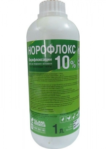 Норофлокс 10% оральний антибіотик.Діюча речовина енрофлоксацин.Застосовують для лікування колібактеріозу,сальмонельозу,некротичного ентериту,стрептококозу,гемофільозу,кампілобактерійного гепатиту,мікоплазмозу,а також змішаних інфекцій птиці. Дозування 1мл на 1 л.води 3-5 днів підряд. Аналог: Байтрил, енрофлокс,енрофлоксацин орал.