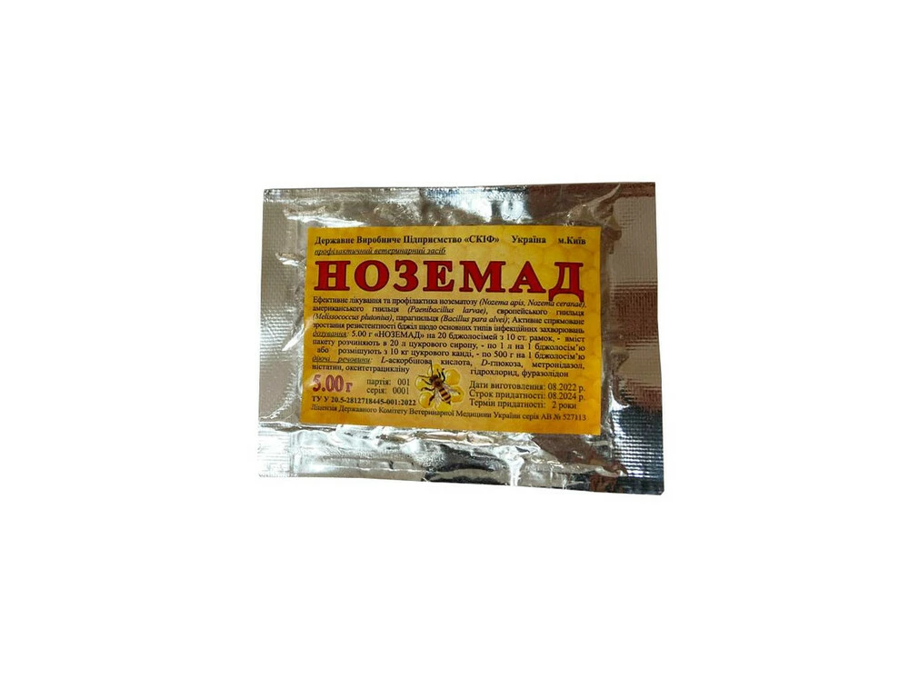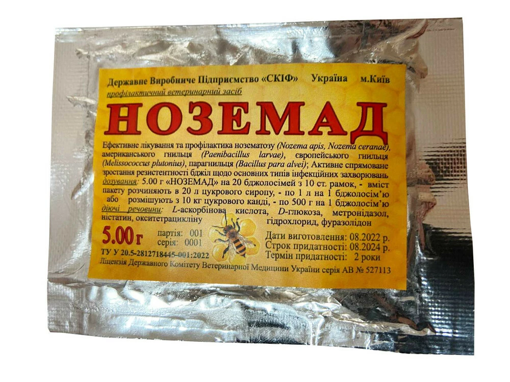 Дозування та спосіб застосування: Вміст пакету препарату «Ноземад», вагою 5 грам, використовують для приготування 20 доз готової до використання лікувальної форми (20 бджолосімей).