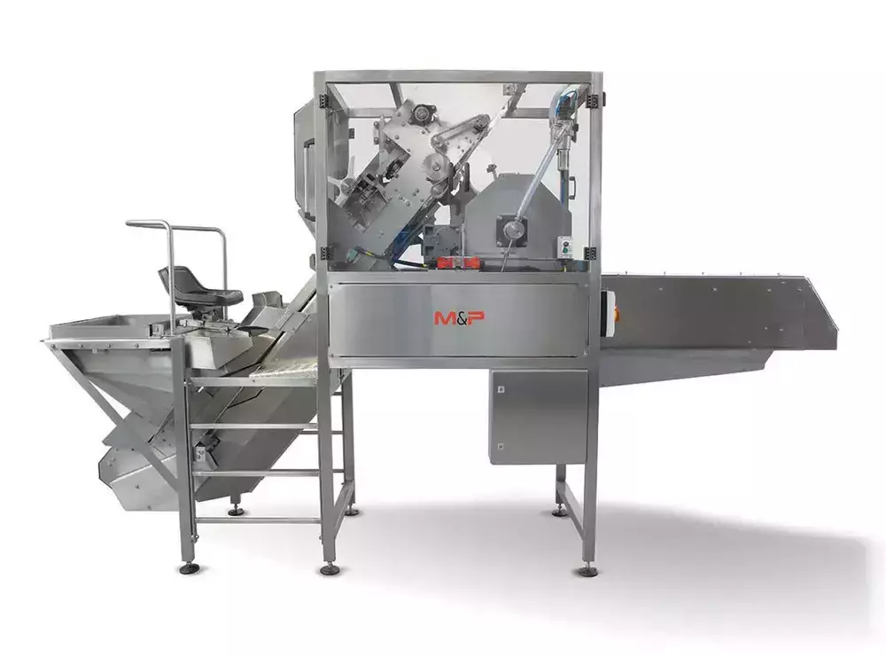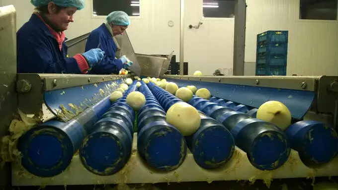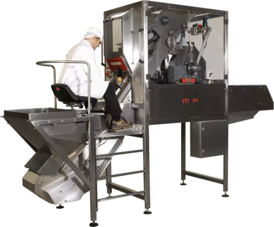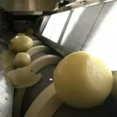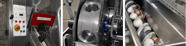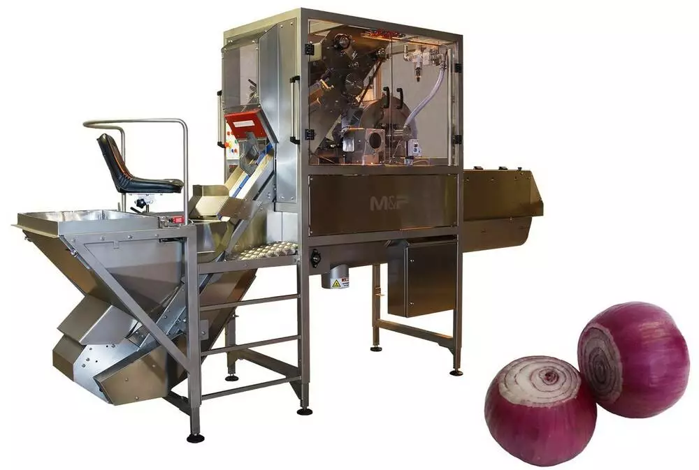 Машина забезпечує повний цикл очищення цибулі від 45 до 115 мм. Обрізання шийки та кореневища відбувається за одну операцію, потім надрізається шкірка і після видаляється стисненим повітрям. Жодних змінних частин не потрібно. Цибуля відбирається з бункера автоматично, а потім оператором встановлюється таким чином, щоб верхівки та хвости розташовувалися горизонтально щодо тримачів.