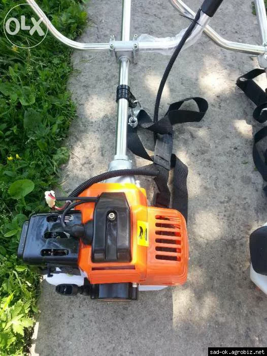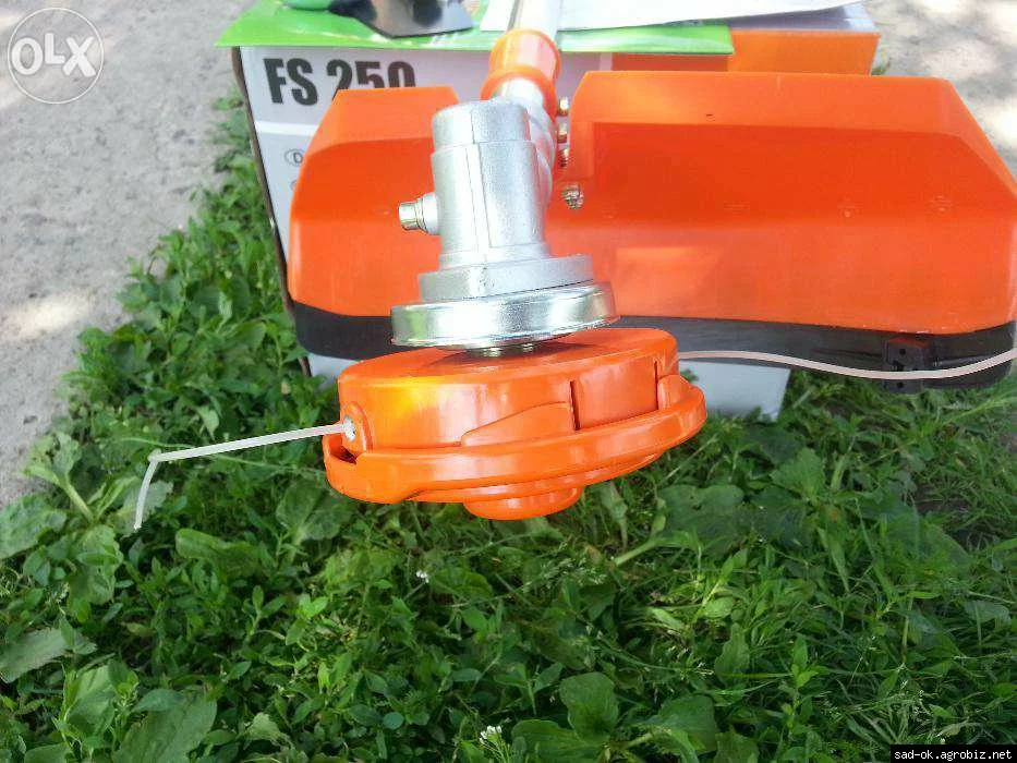 В комплекте также идет инструмент для регулировки и обслуживания, мерная бутылочка для приготовления смеси, ремень, нож 3 лопасти, шпулька с леской.