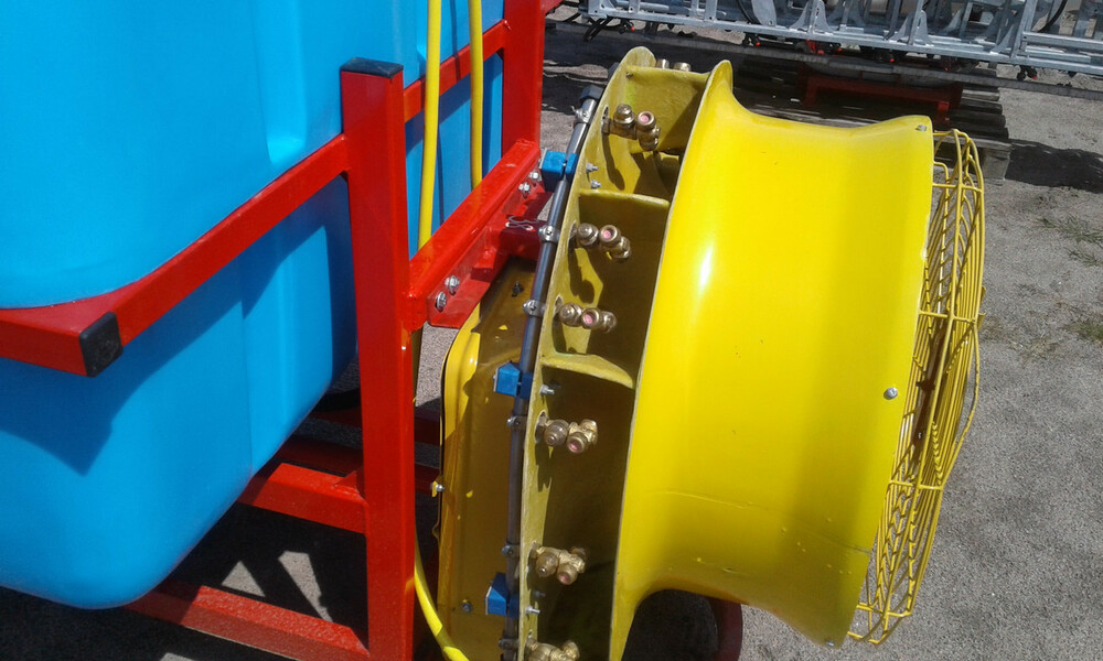 Обприскувач навісний садовий вентиляторний використовується в сільському господарстві, садівництві та квітникарстві в якості пристрою, за допомогою якого вносяться добрива в ґрунт і обприскування пестицидами стебла та листя фруктових дерев, а також виноградників. Завдяки спеціально розробленій конструкції та габаритам садовий обприскувач зручний у роботі та легко транспортується. Специфічної особливості цього агрегату є вбудований вентилятор, що створює завихрення потоку повітря, що дає можливість обприскування оброблюваних культур з усіх боків. Об'єми резервуарів 800 літрів. В обприскувачах використовується насос фірми Tad Len продуктивністю 100 л/хв. Навісні садові обприскувачі використовуються тільки в парі з трактором або іншою важкою технікою, тому добре підійдуть для оброблення великих садових садових угод. Агрегат навішують на трактори та мінітрактори. Сам обприскувач має бак різними об'ємами, а також мембранний насос і вентилятор. За допомогою вентилятора створюються такі завихрення потоку, що рідина розпорошується рівномірно, потрапляючи навіть на тильний бік листа рослини. Обприскувач садовий можуть комплектуватися як польським, так і італійським (латунним) розпилильним обладнанням, залежно від потреб замовника. Висота розпилення до 6 метрів. Ширина розпилення до 8 метрів