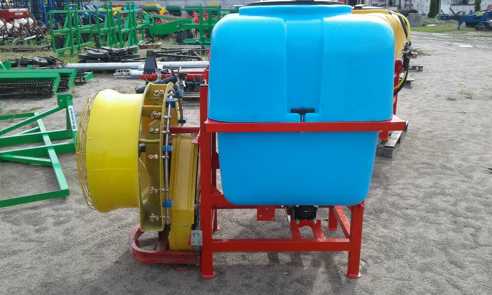 Обприскувач навісний садовий вентиляторний використовується у сільському господарстві, садівництві та квітникарстві в якості пристрою, за допомогою якого вносяться добрива в грунт і обприскуються пестицидами стебла і листя фруктових дерев, а також виноградників. Завдяки спеціально розробленій конструкції і габаритами садовий обприскувач зручний в роботі і легко транспортується. Специфічною особливістю даного агрегату є вбудований вентилятор, який створює завихрення потоку повітря, що дає можливість обприскування оброблюваних культур з усіх боків. Обсяги резервуарів 800 літрів. В обприскувачах використовується насос фірми Tad Len продуктивністю 100 л/хв. Навісні садові обприскувачі використовуються тільки в парі з трактором чи іншою важкою технікою, тому добре підійдуть для обробки великих садових угідь. Агрегат навішують на трактори та міні-трактори. Сам обприскувач має бак різними обсягами, а також мембранний насос і вентилятор. З допомогою вентилятора створюються такі завихрення потоку, що рідина розпилюється рівномірно, потрапляючи навіть на тильну сторону листка рослини. Обприскувач садовий можуть комплектуватися як польських так і італійським (латуні) розпилювальний обладнанням, в залежності від потреб замовника. Висота розпилення до 6 метрів. Ширина розпилення до 8 метрів