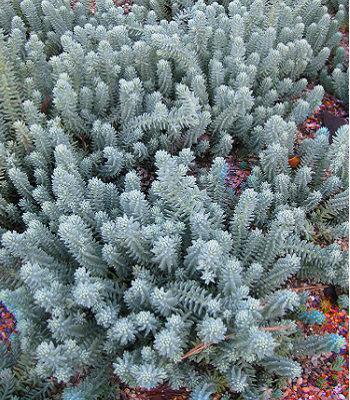 Невибагливий і просто ідеальний сорт! Назва сорту звучить в перекладі як ''Блакитна ялина''. І він дійсно нагадує гілочки ялини. Рослина утворює густе килимове покриття з сизо-блакитного листя, яке схоже на ялинову хвою. У червні насичено-лілові і рожеві стебла піднімаються і увінчуються блискучими жовтими квітами. Розростається швидко, заповнюючи простір між каменями сизо-блакитною зеленню. Дуже добре підходить для альпінаріїв, рокаріїв. Морозостійкий.