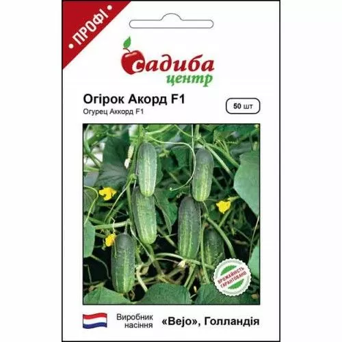 Акорд F1-ранній гібрид огірка, переважно жіночого типу цвітіння. Вегетаційний період 40-45 днів. Рослина сильна, формує однорідні плоди світло-зеленого кольору з тоненькою шкіркою, вкритою рідкими шипами. Має відмінні смакові та засолочні якості. Дає стабільний високий урожай, особливо в початковий період плодоношення. Толерантний до борошнистої роси, вірусу огіркової мозаїки, переноспорозу. Високий вихід товарної продукції.