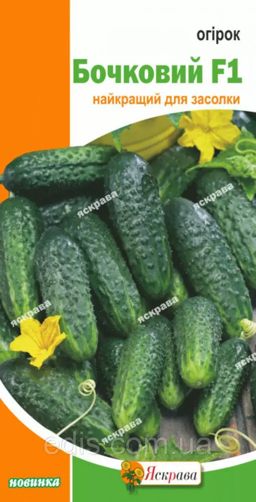 Огірок Бочкової F1 0,5 гЗеленец темно-зеленый, длиной 7-9 см, цилиндрической формы, мелкобугристий. Гибрид пригоден для употребления в свежем виде, засолки в бочках. Отличный вкус и внешний вид огурцов в сочетании с высокой урожайностью позволяет использовать их не только для собственного потребления, но и на продажу. Преимущественно женского типа цветения, завязь букетная, в пазухе 3-4 завязи. Для огурца пригодны, среднесуглинистые, воздухопроницаемые почвы. Хорошие предшественники - картофель, лук, капуста, перец. Огурцы выращивают, высевая семена в почву или через рассаду. Для отримання розсади насіння загортають на глибину 1,5-2 см, при температурі 25 °С. При появі сходів температуру знижують до 15 °С. Розсаду висаджують у гунт, коли мине загроза заморозків. Висівають насіння огірків в прогріту до 14-15 °С грунт. Глибина загортання 2-3 див. Посіви слід укрити плівкою. Обробляють рядовим способом за схемою 40-50 див. Догляд полягає в прополці, розпушуванні, поливі і підгодівлі. Полив слід здійснювати після заходу сонця теплою водою.