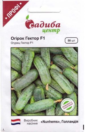 Гектор F1 - надранній кущовий гібрид огірка з переважно жіночим типом цвітіння. Рослина дуже компактна, з рясним плодоношенням. Відмінно переносить загущення, придатний для механізованого збирання. Плоди однорідні, крупногорбкуваті, білошипі, циліндричні, однорідного темно-зеленого забарвлення, не жовтіють, відмінне співвідношення товщини мякоті і насіннєвої камери, відмінний смак, підходить для використання у свіжому вигляді і засолки. Хороша транспортабельність і лежкість.