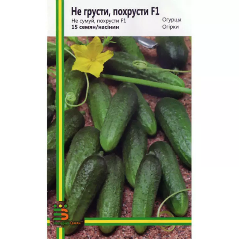 Огірок Не сумуй, похрумти - це ранньостиглий, бджолозапильний гібрид, період від сходів до початку плодоношення 40-45 днів. Призначений для вирощування у відкритому ґрунті та плівкових теплицях. Врожайність висока -13-14 кг/м2. Рослини сильнорослі, мають майже