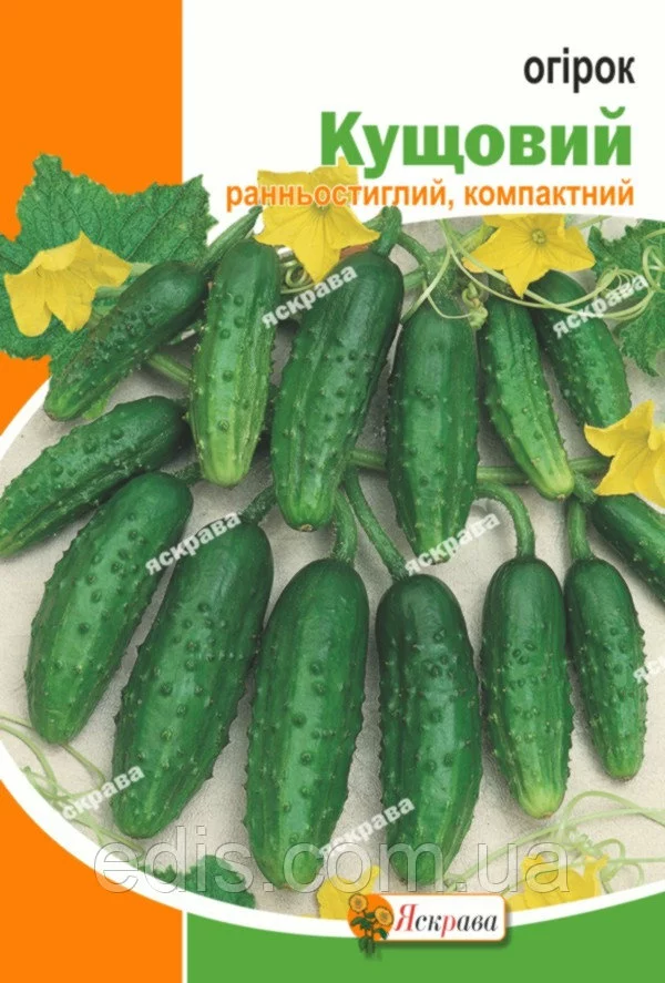 Огірок Кущовий 10 г Компактний, ранньостиглий, високоврожайний, універсального використання. Придатний для вирощування у відкритому гунте. Рослина кущової форми. Від появи сходів до першого збору плодів проходить 40-45 днів. Плоди у фазі споживчої стиглості циліндричні, завдовжки 9-12 см, масою 100-120 р. Шкірка зелена, крупнобугорчатая, з чорними колючками і світлими смугами до половини плоду.