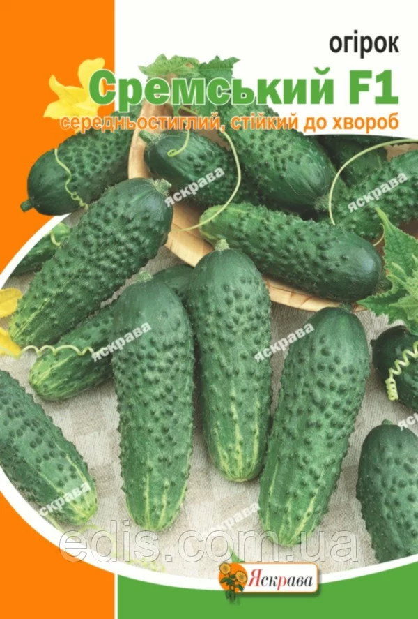 Огірок Сремский F1 5 гСередньостиглий, універсального використання. Для відкритого і закритого гунта. Плоди у фазі споживчої стиглості циліндричні, зелені, з смугами до половини довжини плоду, з великими горбиками і білими колючками, з невеликою насіннєвою камерою, довжиною 9-12 див. Не мають схильності до пожовтіння. У плодах відсутній гіркоту. Відносно стійкий до комплексу хвороб. Використовують свіжими, для квашення овочів.