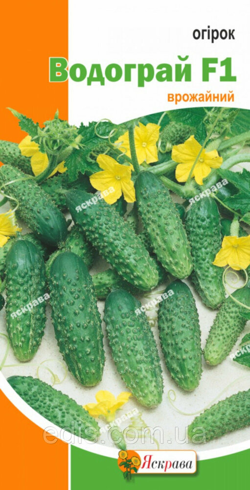 Огірок Водограй F1 0,5 гРанньостиглий гібрид. Вегетаційний період від сходів до початку плодоношення 42-50 днів. Плоди великобугорчасти, зеленого кольору, довжиною 9-11 см, діаметром 4-5 см, масою 90-120 г, вирівняні за формою, відмінних смакових і товарних якостей. Гібрид цінується за високу врожайність і одночасно дозрівання плодів. Використовують для споживання у свіжому вигляді, консервації та засолу.