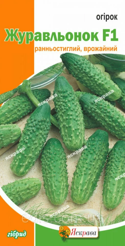 Огірок Журавльонок F1 0,5 гРанньостиглий, бджолозапильний гібрид. Рослина довгоплетиста, переважно жіночого типу цвітіння. Зеленець хрусткий, без гіркоти, еліпсоїдної форми, з розмитими смугами, поверхню крупнобугорчатая, завдовжки 9-11 см, масою 80-110 р. Гібрид відносно стійкий до борошнистої роси. Період плодоношення 40-50 днів. Універсального призначення.