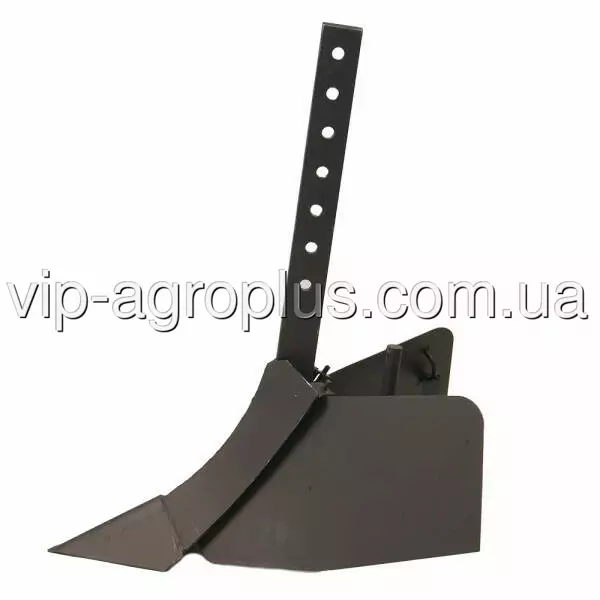 Стійка виготовлена зі сталевої смуги 10 × 40 × 400 мм. Є 6 отворів діаметром 12,5 мм, під болт М12. Носок відвалу виготовлений з вигнутої сталевої пластини товщиною 3 мм. Вигин і підсилювачі з внутрішньої сторони надають йому необхідний запас жорсткості. Нерухома частина відвалу складається з двох пластин товщиною 3 мм. Опорна пластина товщиною 4 мм має регулювання по висоті. Максимальна ширина між краями крил – 460 мм (рекомендована ширина обробки 400 мм). Висота до верхньої кромки – 270 мм. Товщина крила відвалу – 2 мм. Присутня регульована п'ятка.