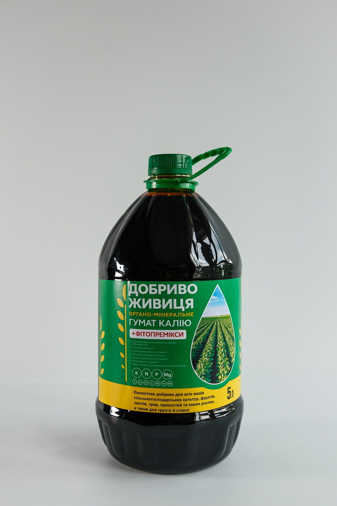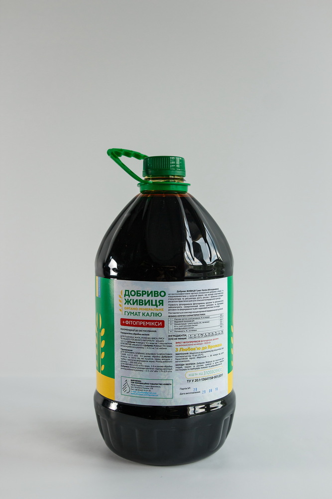 ДОБРИВО ЖИВИЦЯ Гумат Калію (фітопремікси) – це високоефективне гумінове добриво у вигляді концентрованої суспензії з мікроелементами в хелатній формі, яке володіє властивостями стимулятора та регулятора росту рослин і являється антидепресантом практично для усіх сільськогосподарських культур.