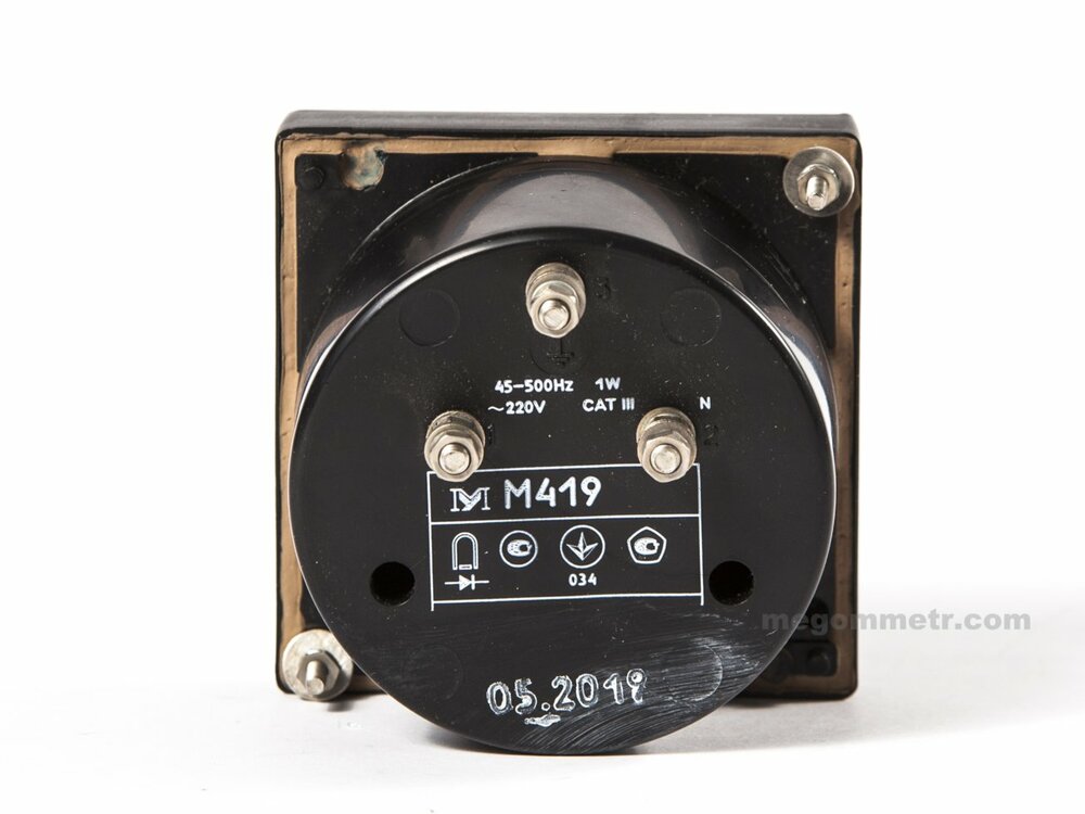 Омметр М419 предназначен для измерения сопротивления изоляции сетей переменного тока с изолированной нейтралью напряжением до 420 V и частотой от 45 Hz до 500 Hz. Применяется в передвижных электроагрегатах и стационарных электроустановках. Прибор щитовой. Рабочее положение вертикальное.
