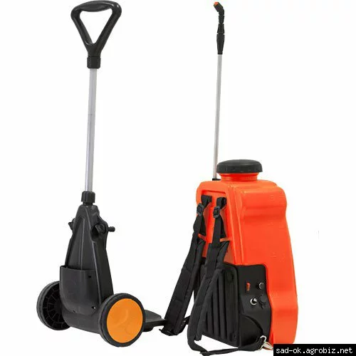 - аккумуляторная модель повышенной мобильности, которую можно носить не только за спиной, но ещё и возить на специальной подставке с колёсами. Полный заряд батареи и 16 л раствора позволят в течение 3 часов обработать средний сад.