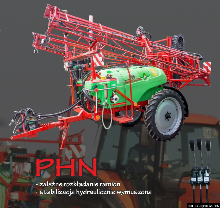 Балки типа PHN (15, 16, 18, 20 и 21 м) – балки, полностью управляемые гидравлически, складывание, зависимое (симметрично) вдоль оси опрыскивателя; все функций балки, управляемые гидравлически (складывание, раскладывание, поднимание, стабилизация).