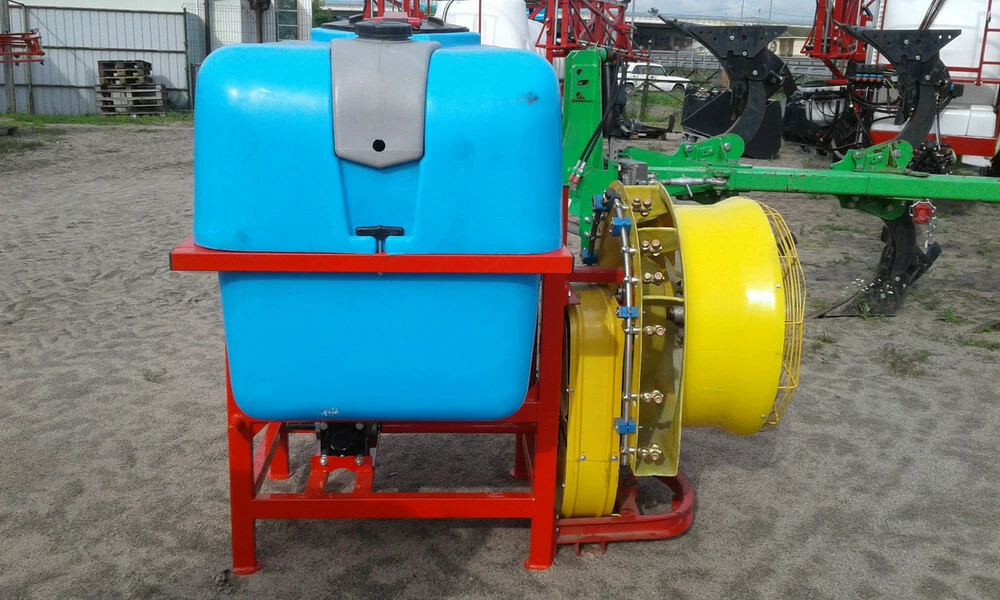 Опрыскиватель навесной садовый вентиляторный используется в сельском хозяйстве, садоводстве и цветоводстве в качестве устройства, посредством которого вносятся удобрения в почву и опрыскиваются пестицидами стебли и листья фруктовых деревьев, а также виноградников. Благодаря специально разработанной конструкции и габаритам садовый опрыскиватель удобен в работе и легко транспортируется. Специфической особенностью данного агрегата является встроенный вентилятор, создающий завихрения потока воздуха, что дает возможность опрыскивания обрабатываемых культур со всех сторон. Объемы резервуаров 800 литров. В опрыскивателях используется насос фирмы Tad-Len производительностью 100 л./мин. Навесные садовые опрыскиватели используются только в паре с трактором или другой тяжелой техникой, поэтому хорошо подойдут для обработки обширных садовых угодий. Агрегат навешивают на тракторы и минитракторы. Сам опрыскиватель имеет бак разными объемами, а также мембранный насос и вентилятор. С помощью вентилятора создаются такие завихрения потока, что жидкость распыляется равномерно, попадая даже на тыльную сторону листа растения. Обприскувач садовий можуть комплектуватися як польських так і італійським (латуні) розпилювальний обладнанням, в залежності від потреб замовника. Висота розпилення до 6 метрів. Ширина розпилення до 8 метрів