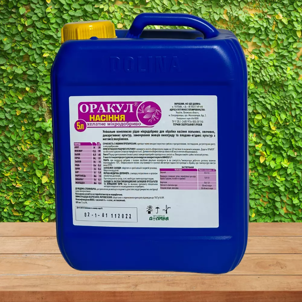 Оракул Насіння – це унікальне комплексне рідке мікродобриво для обробки насіння польових, овочевих, декоративних культур, бульб картоплі, замочування живців винограду та плодово-ягідних культур з метою їх вкорінення.