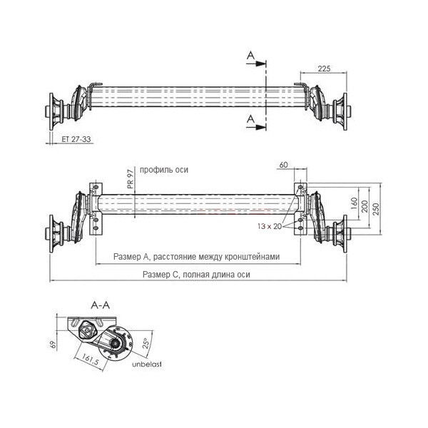 Общая длина оси (размер С): 1650 мм, 1750 мм, 1850 мм, 1950 мм, 2000 мм, 2150 мм, 2350 мм
