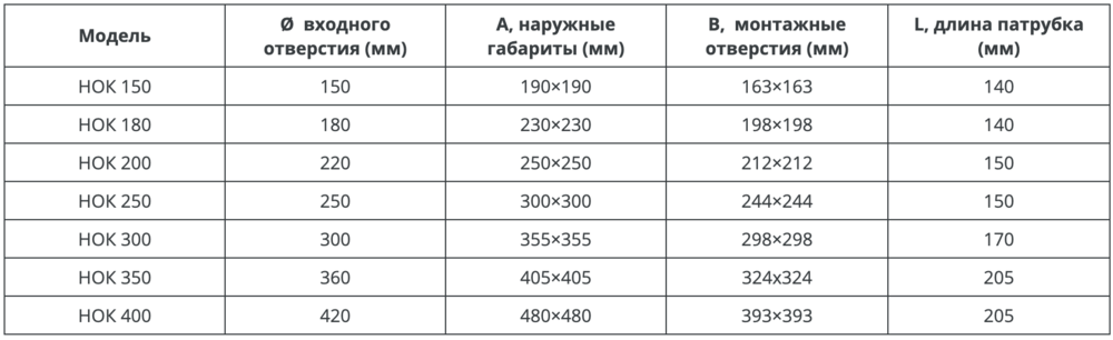 | Модель | Ø входного отверстия (мм) | А, наружные габариты (мм) | B, монтажные отверстия (мм) | L, длина патрубка (мм) |