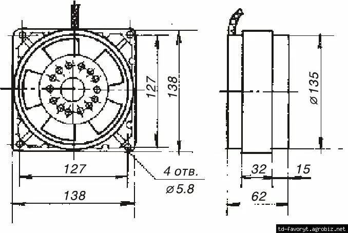 lКорпус вентилятора квадратной формы и имеет внешние радиальные ребра, которые служат для крепления статора. Все типы вентиляторов производятся в различных модификациях, подходящих для присоединения к воздуховодам с сечением 90, 100, 120, 135 и 150 мм.