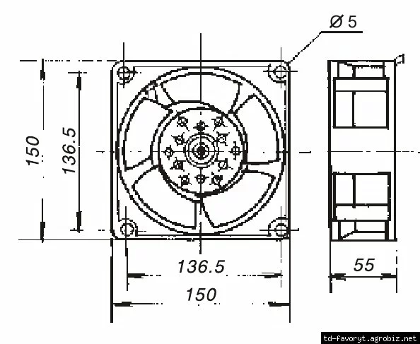 lКорпус вентилятора квадратной формы и имеет внешние радиальные ребра, которые служат для крепления статора. Все типы вентиляторов производятся в различных модификациях, подходящих для присоединения к воздуховодам с сечением 90, 100, 120, 135 и 150 мм.