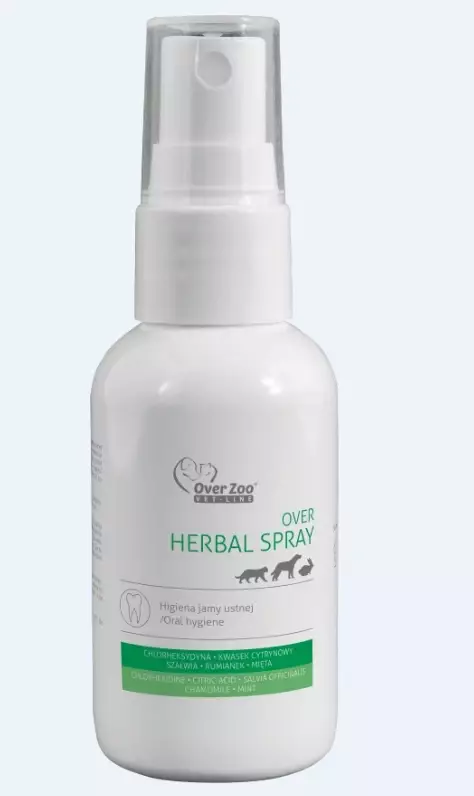 Over Zoo Over Herbal Spray - прекрасний засіб у вигляді спрею для гігієни порожнини рота та зменшення зубного каменю у собак та котів. Містить натуральні інгредієнти, у тому числі м'яту та евкаліпт, які допомагають усунути неприємні запахи.