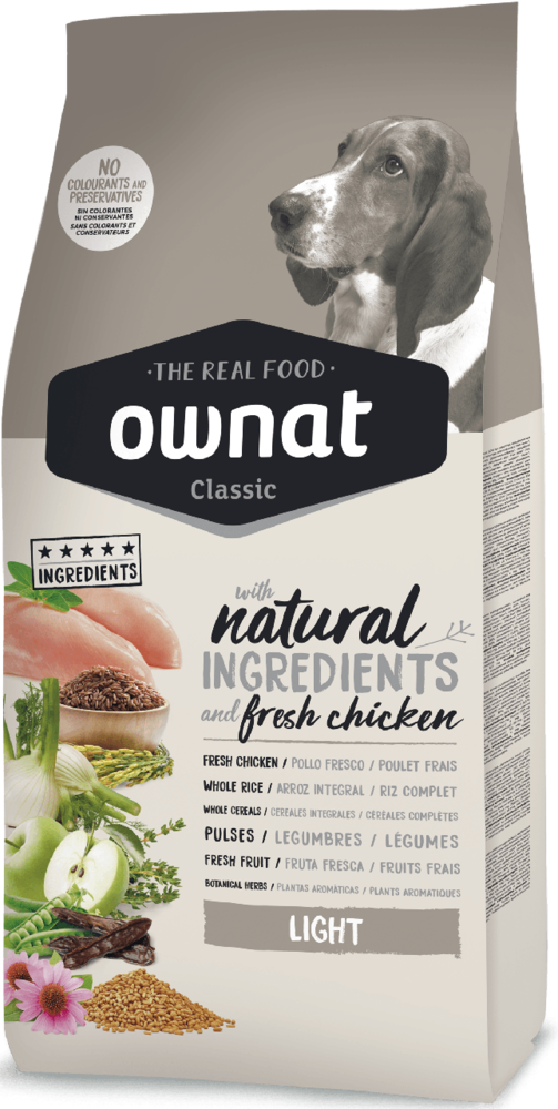 OWNAT CLASSIC LIGHT (DOG) - спеціально розроблена формула для схильних до повноти собак, що має низький вміст жирів, що допомагає знизити рівень споживаних калорій. З погляду поживної цінності цей аспект компенсується високим вмістом білків, що забезпечує правильну підтримку м'язової маси собаки.