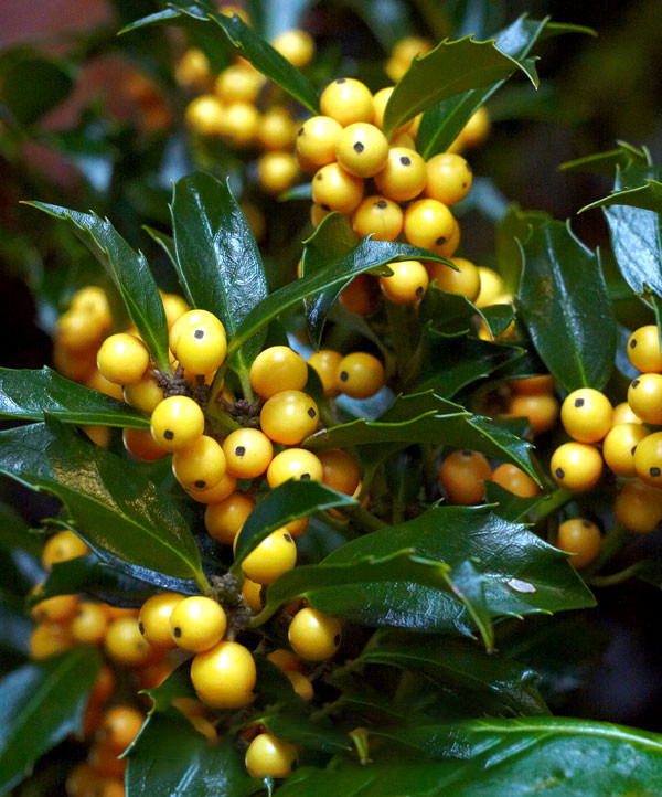 Листя: Щільні, блискучі, шкірясті, з колючими зубцями по краях, синяво-зелені.