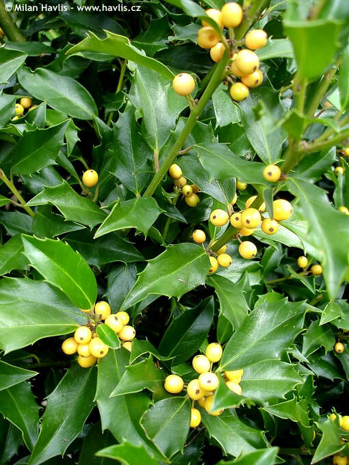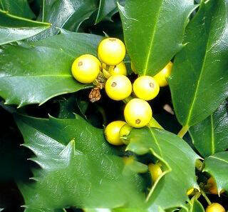 Листя: Щільні, блискучі, шкірясті, з колючими зубцями по краях, синяво-зелені.