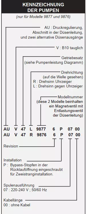 Рідкопаливний шестереньчастий насос E 1001 містить клапан, що регулює тиск, з функцією замикання. Виконання аналогічне насосам J, але насоси Е також можуть бути використані для мазута.