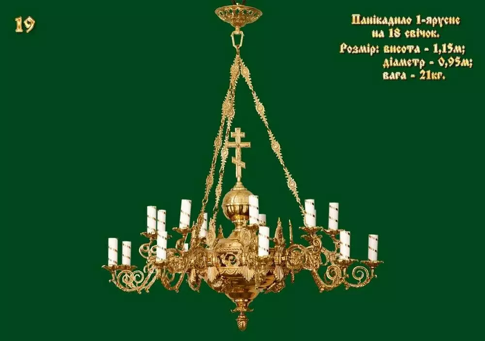 Купити панікадило ручної роботи, золотистого кольору, 1 одноярусне складається з 9 гілок на 18 електричних ламп у вигляді свічок. За бажанням електричні лампочки можна замінити на свічники для свічок будь-якого діаметра.