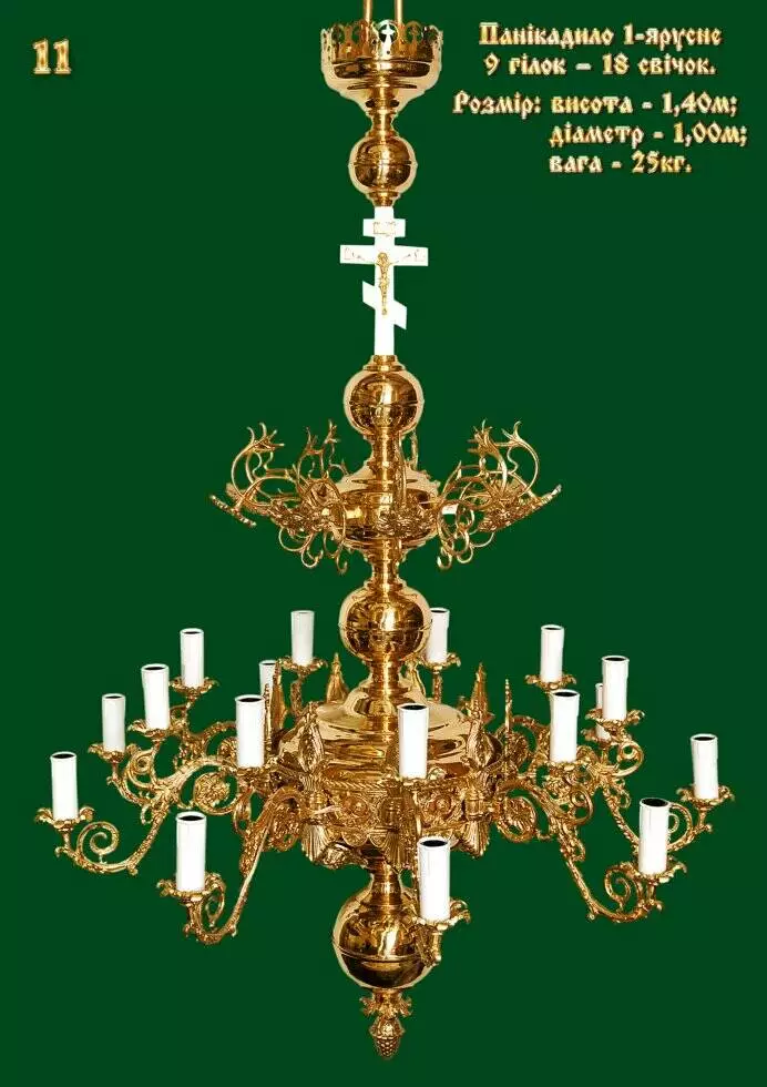 У магазині «Фавор» ви можете вибрати панікадило на один, два або три яруси, а також настінні бра з різною кількістю ламп або свічок. Якщо не знайдете відповідного світильника, наші майстри виготовлять для вас ексклюзивний виріб по наданим кресленням: панікадила, бра, семисвічники, свічники та багато іншого церковного начиння.