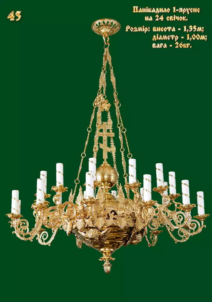 Одноярусне панікадило на 24 свічки, виготовлене професійними майстрами із застосуванням нової технології, яка передбачає підвищення довговічності панікадила і високу стійкість до будь-яких факторів зовнішнього середовища. При виготовленні використовувалася латунь, яка є ідеальним матеріалом для таких виробів.