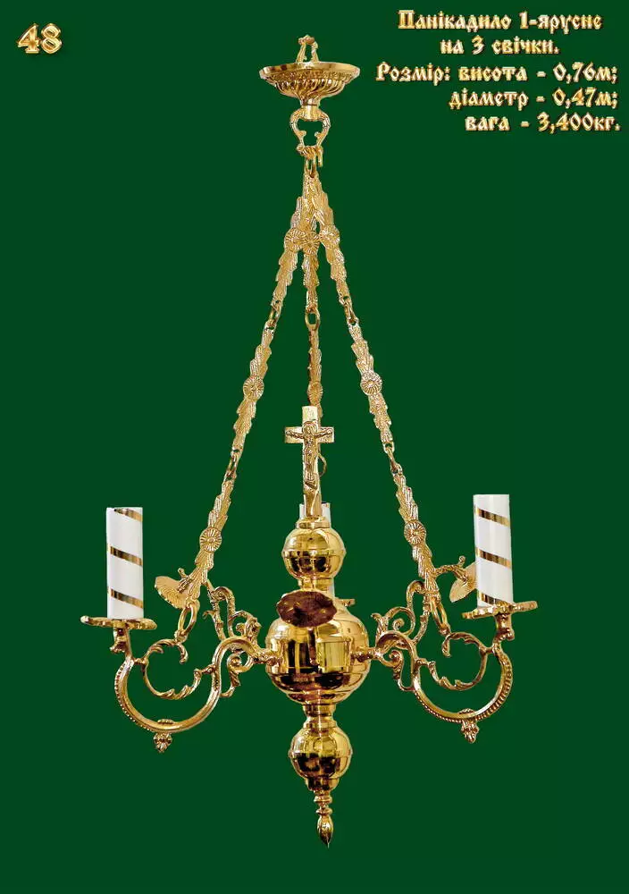 Церковне 1-ярусні панікадило на 3 свічки виготовлено з високоякісного сплаву латуні. Всі покриття конструкції виконані "під золото" і прикрашені різноманітними декоруючими елементами. При виготовленні використовувалася латунь, яка є ідеальним матеріалом для таких виробів.