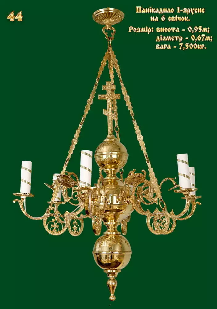 Панікадило - це головний освітлювальний прилад будь-якого храму. Церковне 1-ярусне панікадило на 6 свічок виготовлено з високоякісного сплаву латуні. Всі покриття конструкції виконані "під золото" і прикрашені різноманітними декоруючими елементами.